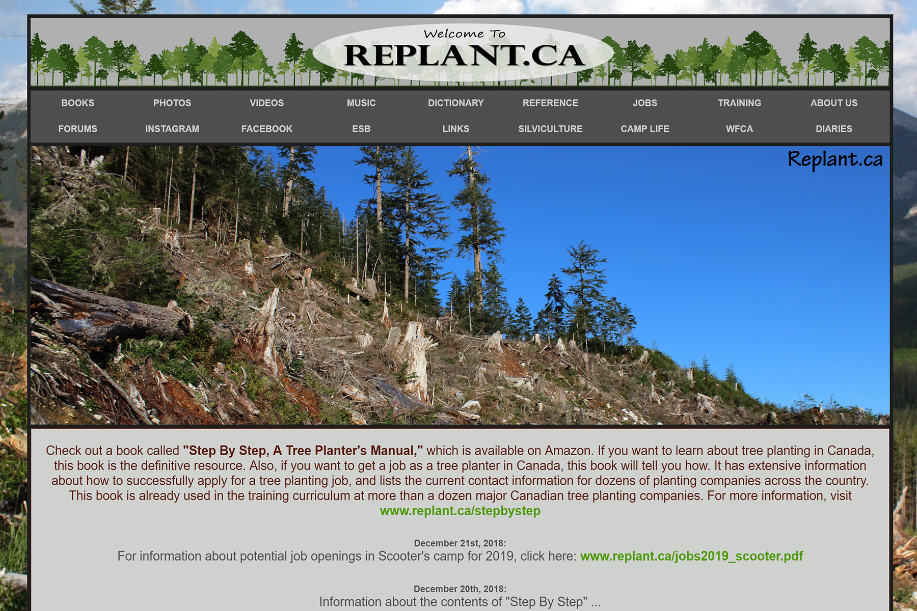 This site contains a wealth of information about preparing yourself for a season of tree planting, and includes great stories, photos, and videos about the culture of tree planting throughout Canada. In addition, this site offers a significant amount of training resources which are used as an industry standard by trainers at many of western Canada's major reforestation companies. Finally, this site offers an online forum with thousands of posts and discussions about planting from the past decade and a half. The forums contain sub-forums with discussions about everything from boots and other gear to campfire gossip. Here are some of the main channels associated with the Replant.ca brand: